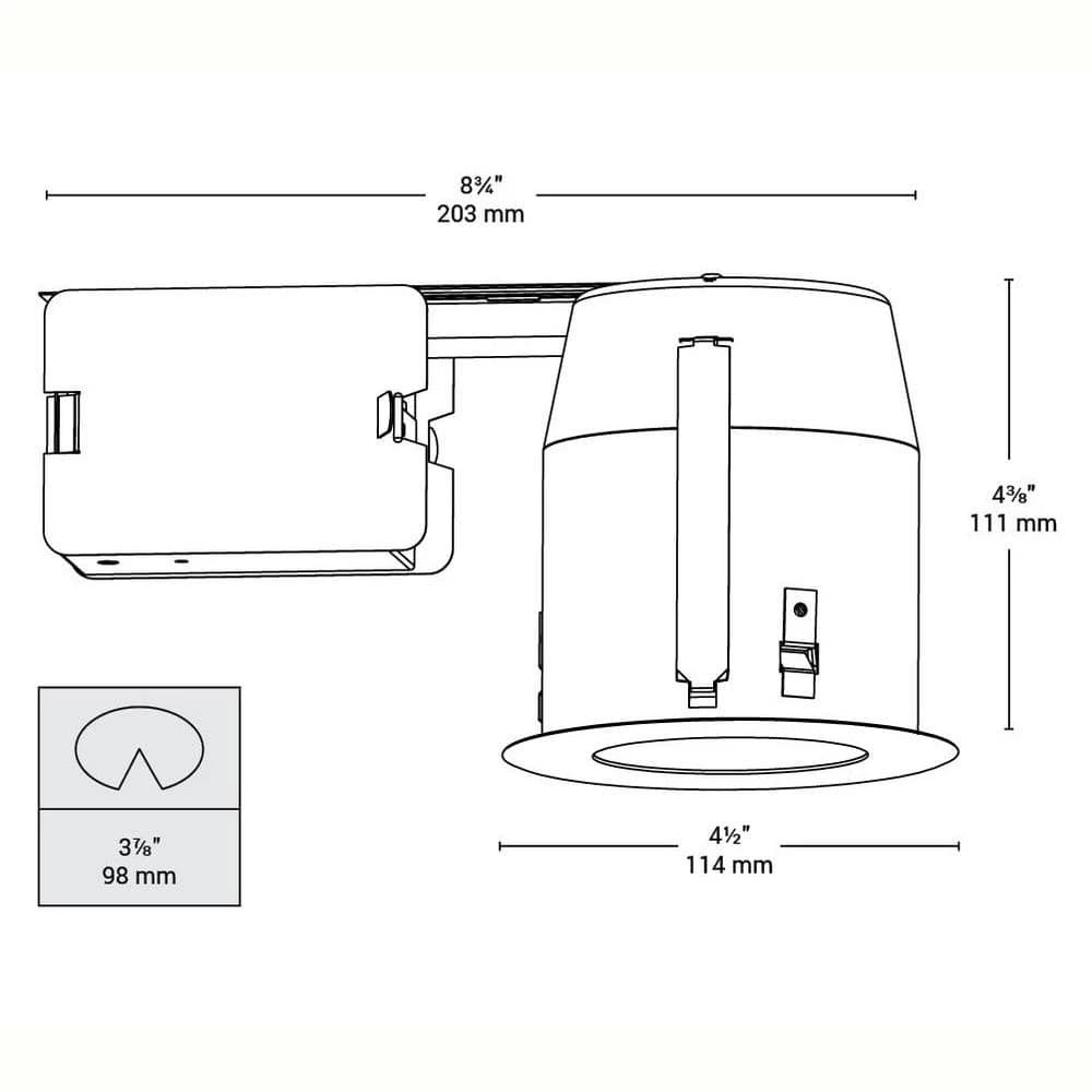 - Hole diameter: 9.8 cm (3 ⅞ in.), ceiling clearance: minimum 11.1 cm (4 % in.), trim diameter: 11.4 cm (4 ½ in.)