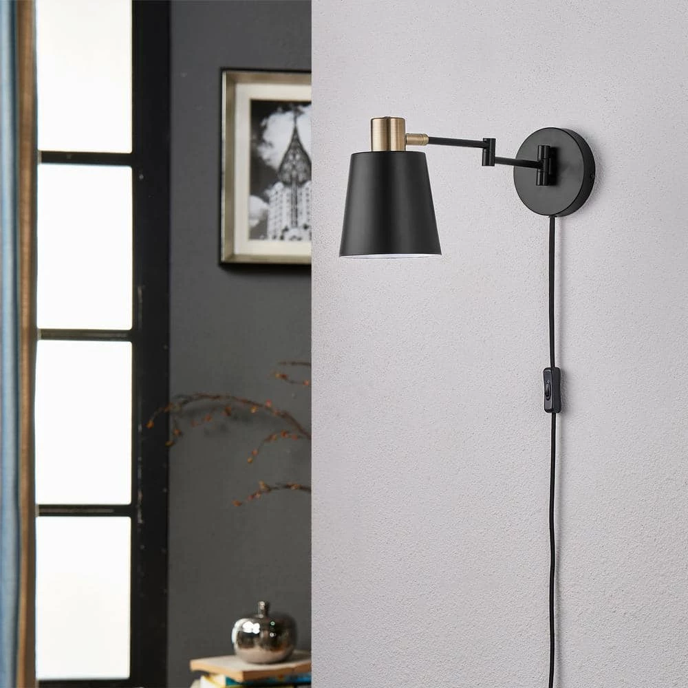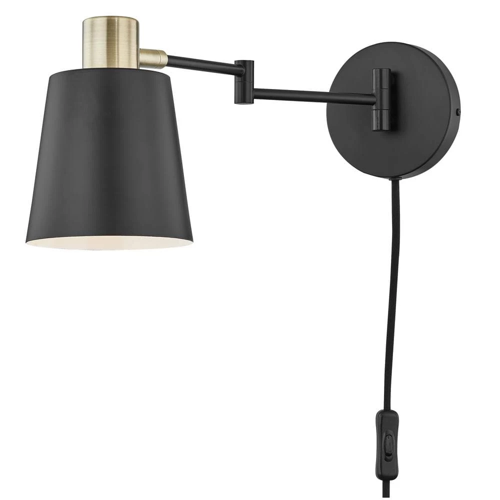 A quintessentially modern interpretation, our Alexi Plug-In Wall Sconce instantly elevates your home lighting scheme. A gently flared shade and round base showcase crisp lines while a brushed antique brass accent infuses sophisticated appeal. Adjust the shade up or down and swivel the dual-jointed arm left or right to achieve flawless brightness for your workspace or relaxing space.