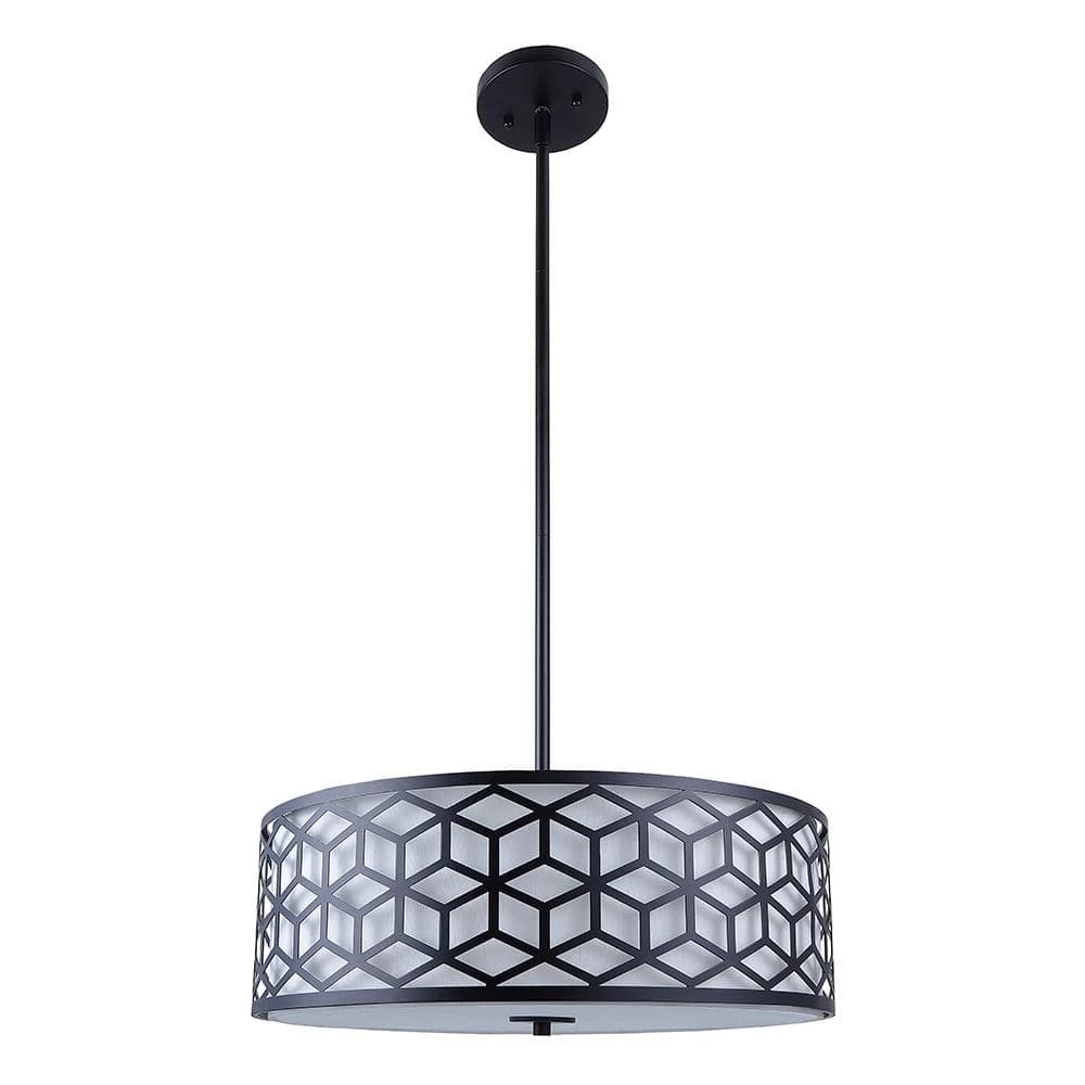 Brighten your home with this charming contemporary 3-light pendant light. With a matte black finish featuring a geometric pattern outer metal shade complemented by a white fabric interior shade, this light pendant is sure to add a touch of modern to any room. The adjustable rod allows for the perfect height in any setting.