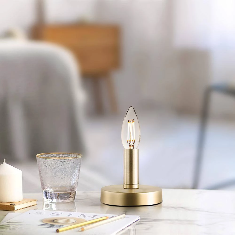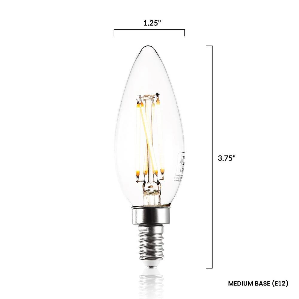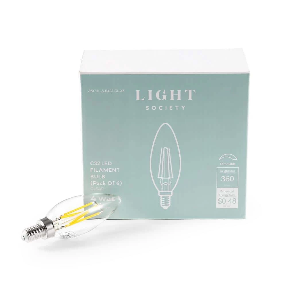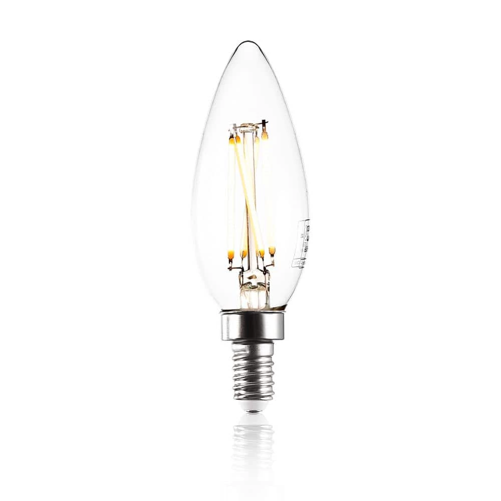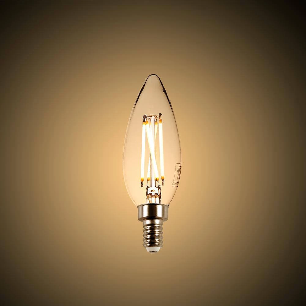 This C32 LED bulb offers modern appeal thanks to its sleek shape and exposed-filament design. A color temperature of 2700K creates warm, inviting illumination, while an E12 medium base ensures compatibility with a variety of lamps and fixtures. Using just 4 -at of power to provide 360 Lumens, this dimmable bulb makes an energy-efficient replacement for a 40-Watt incandescent.