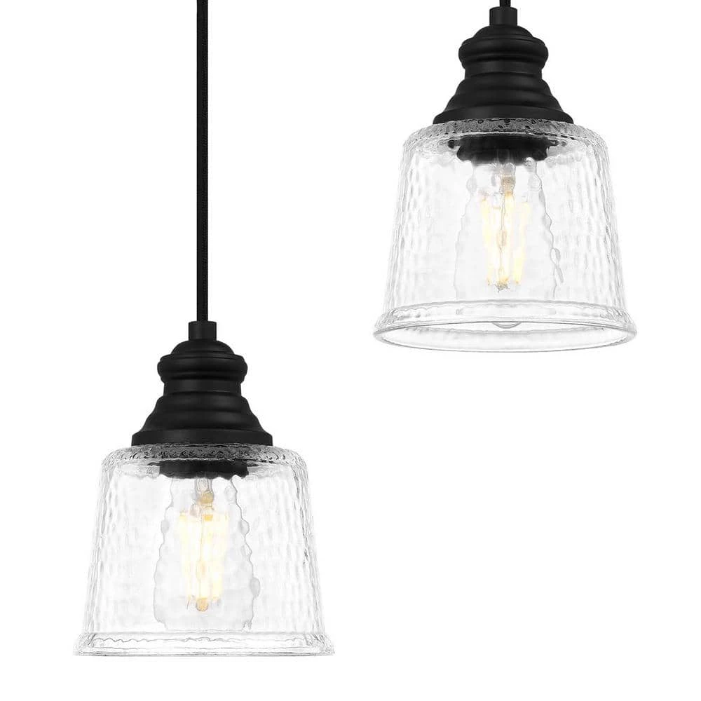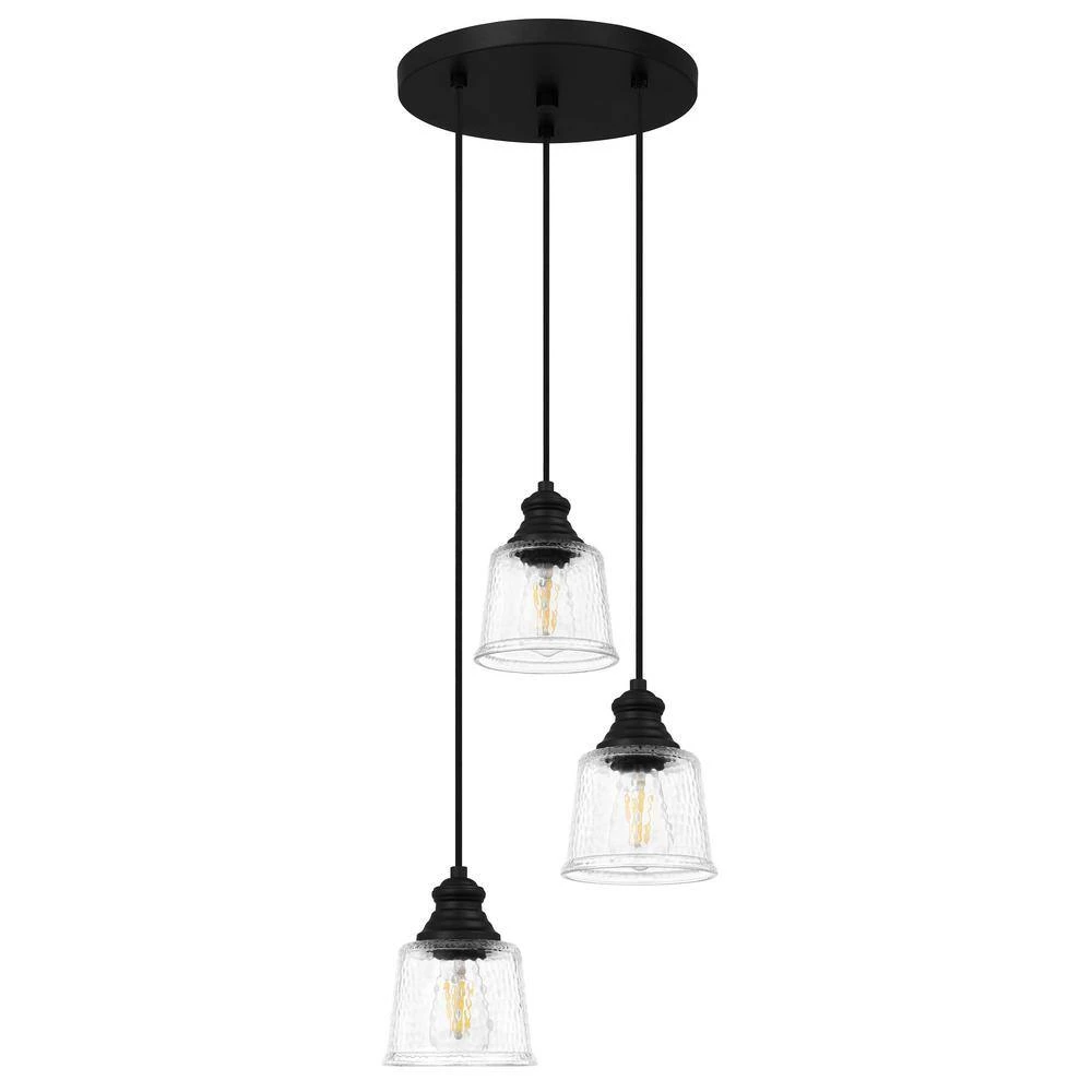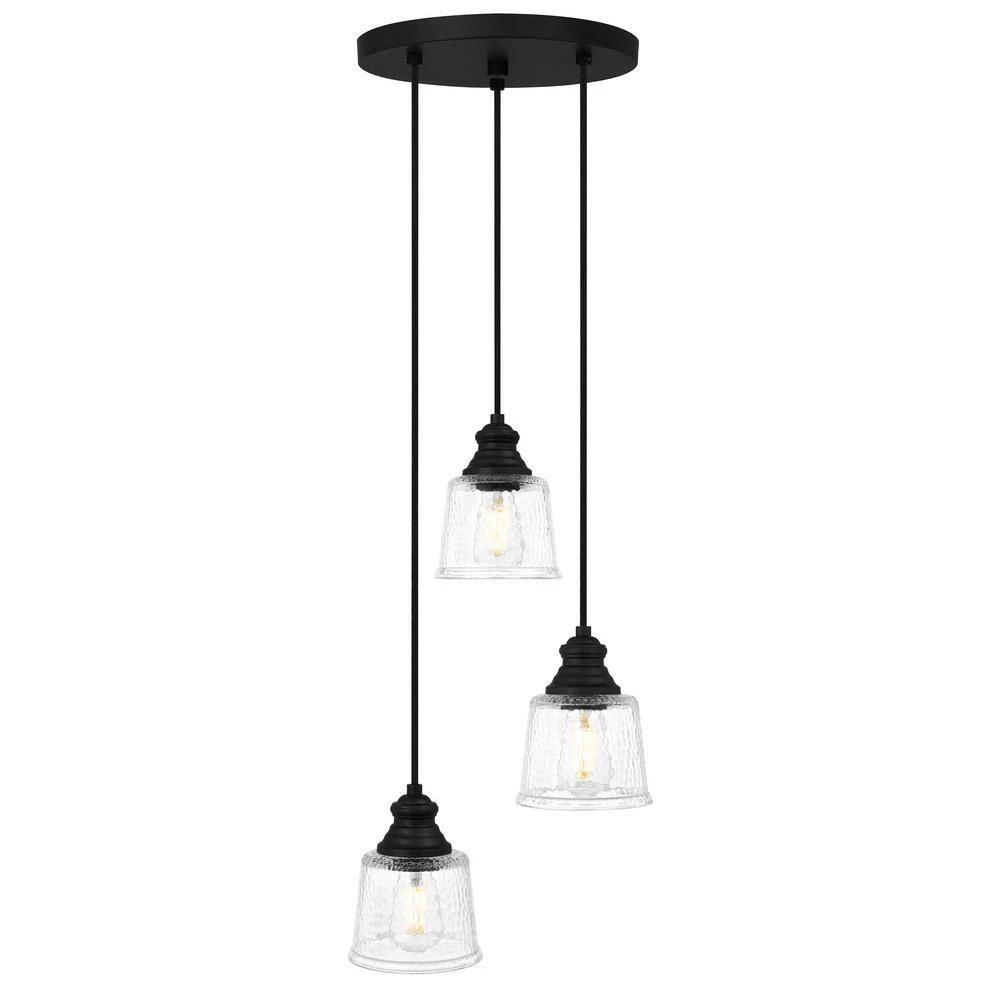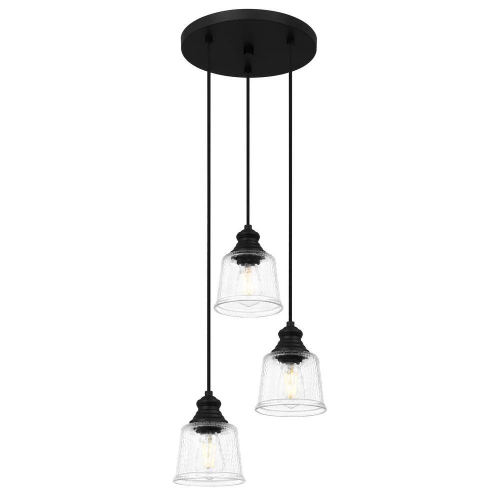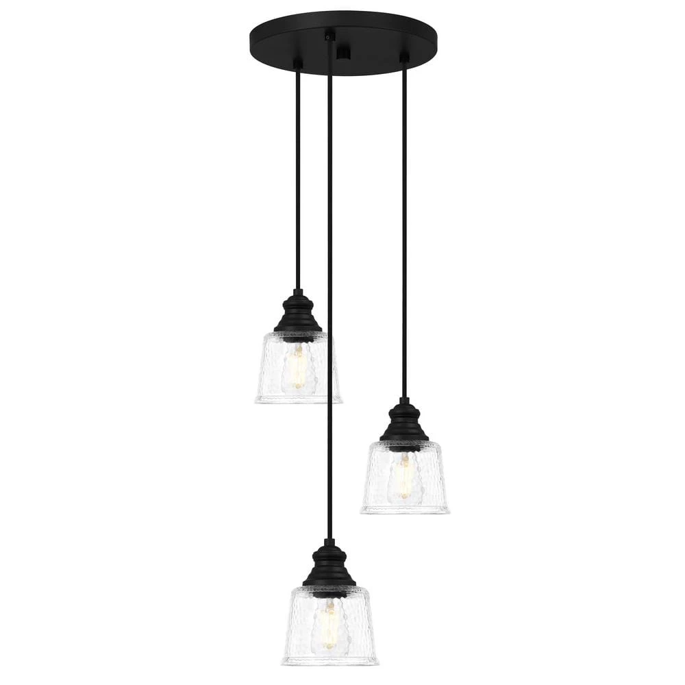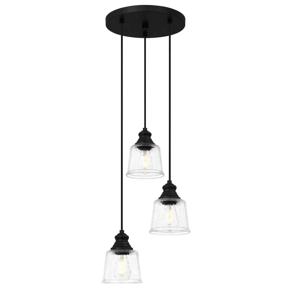 This 3-Light Transitional Pendant is made to last made from steel in a matte black finish with clear water glass style shades. The collection works well with a variety of interiors and blends well into its surroundings. This transitional style can transform a room with its charming versatility.