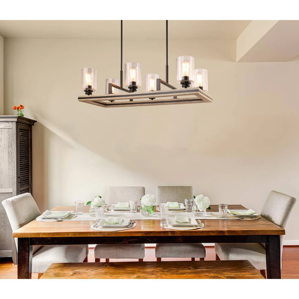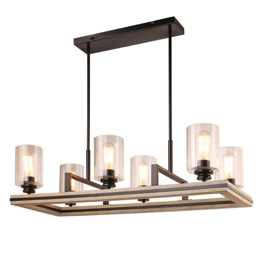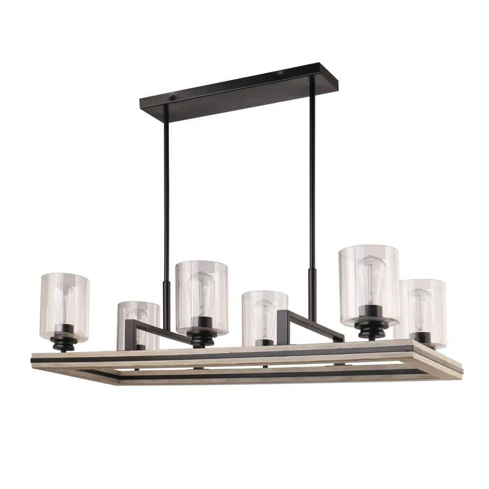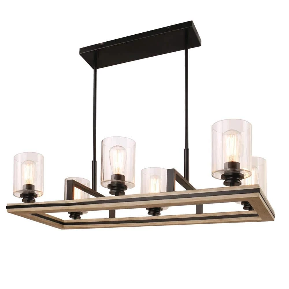 This beautiful 6-light rustic transitional island chandelier is made of steel with a distressed wood finish and contrasting black metal arms. The lights glow inside clear glass cylinders. Edison vintage-style bulbs are a perfect choice to complement the design of this fixture.