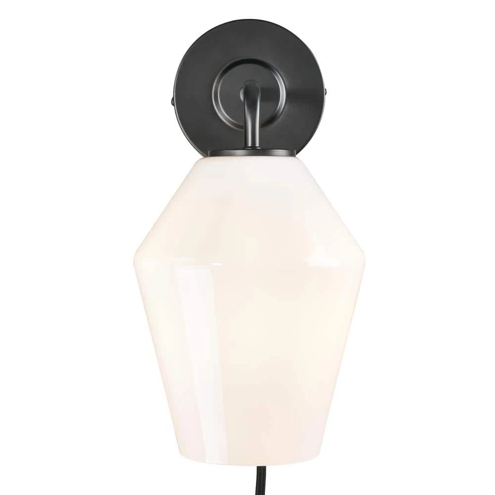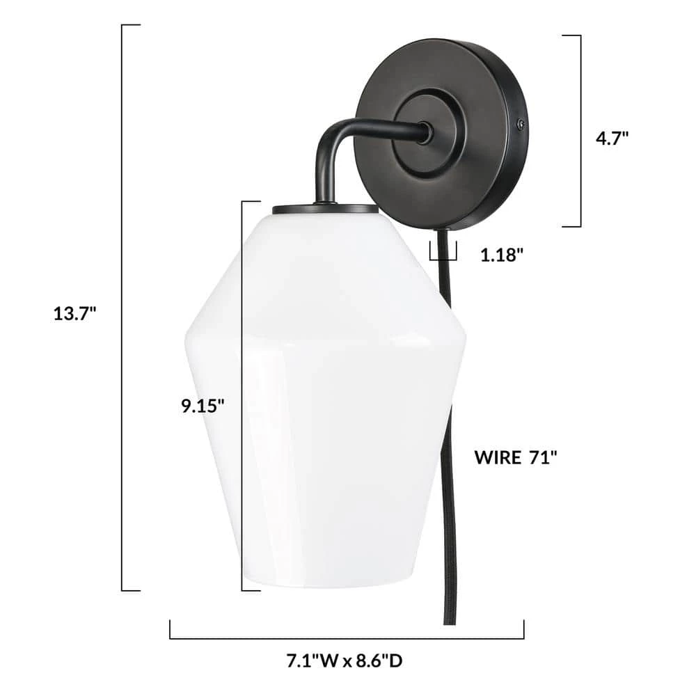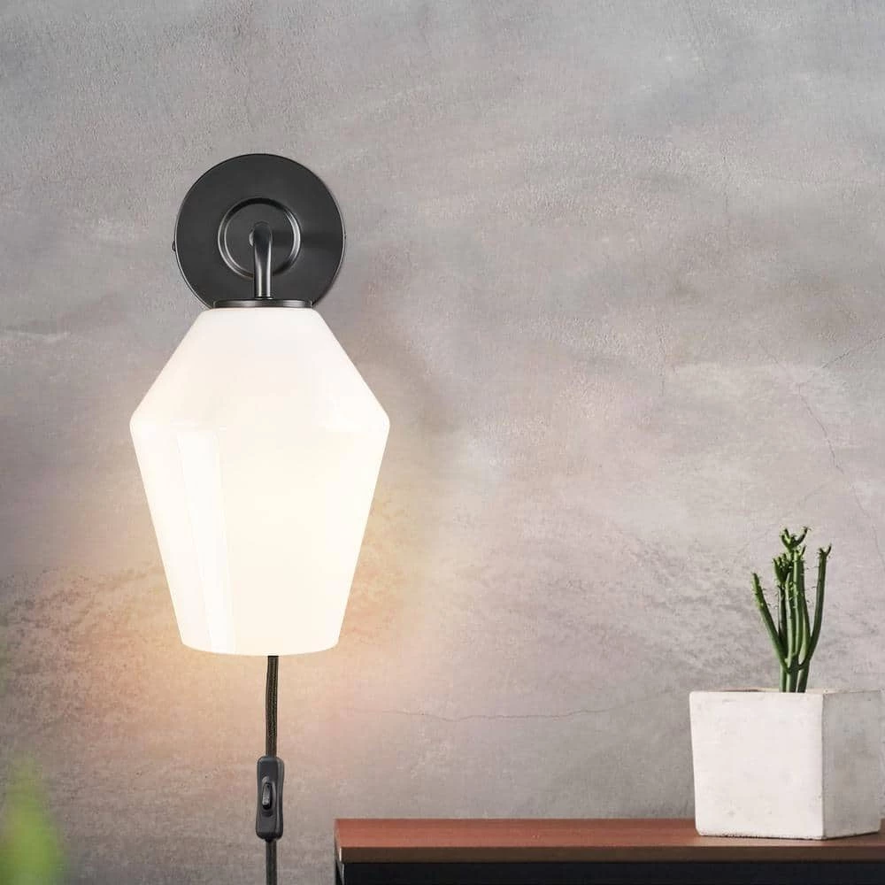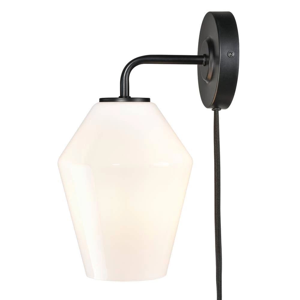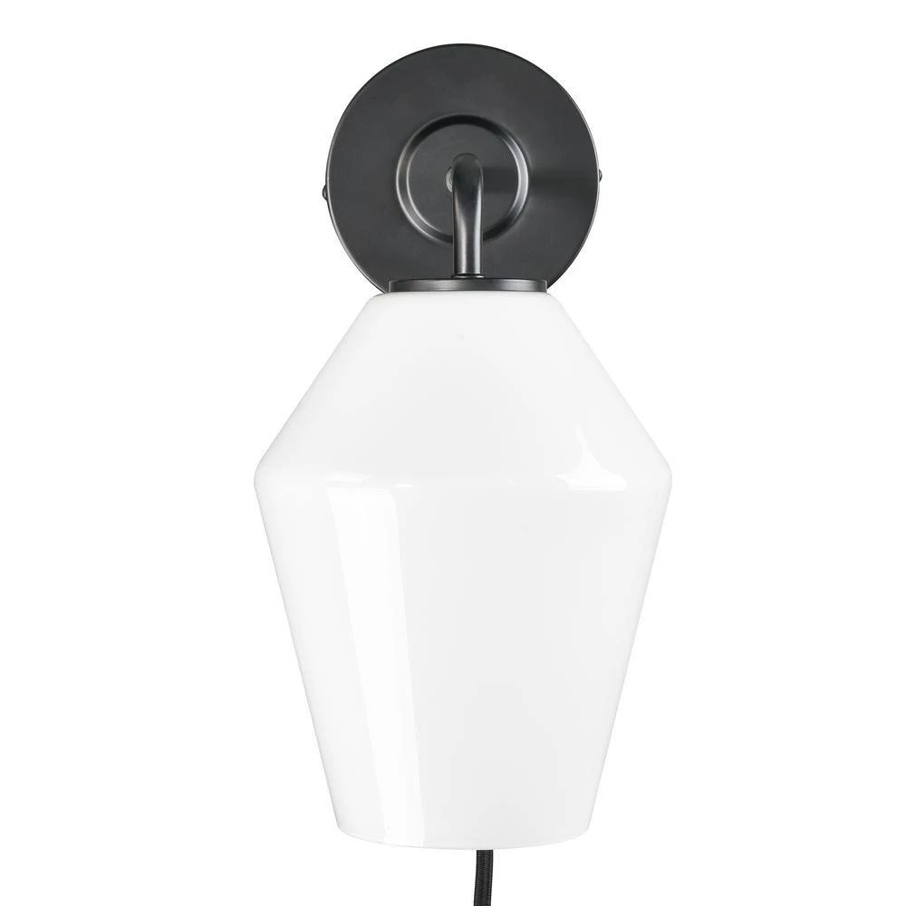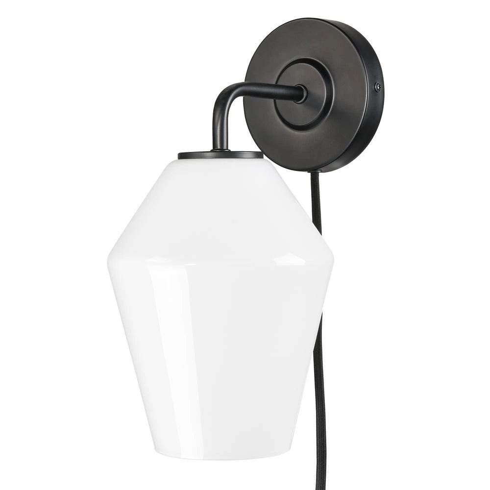 A uniquely-shaped glass shade and iron, come together in a brushed brass or black finish and allow our Clare Plug-In Wall Sconce to shine. Imagine 1 beside your nightstand or lighting your built-in bookshelf. Corded with a convenient on/off switch, this plug-in sconce can look great in any room.