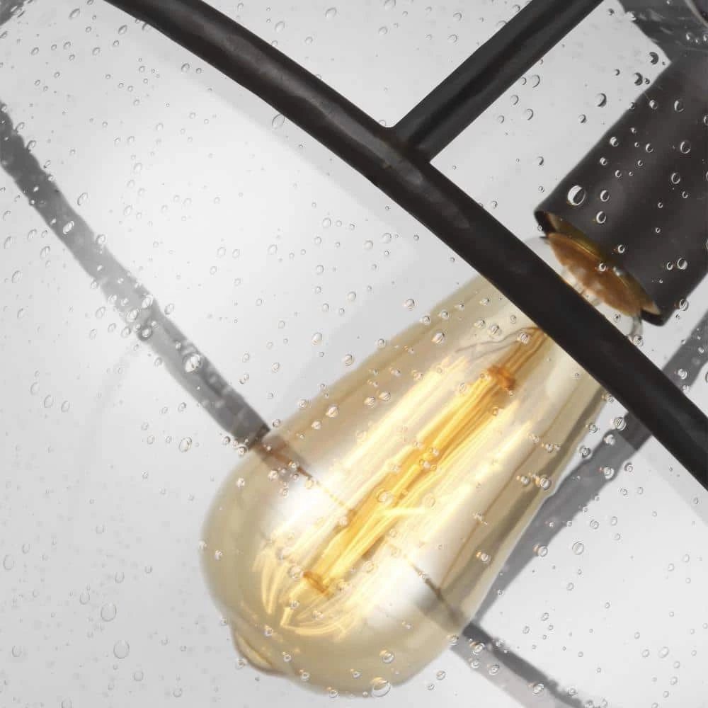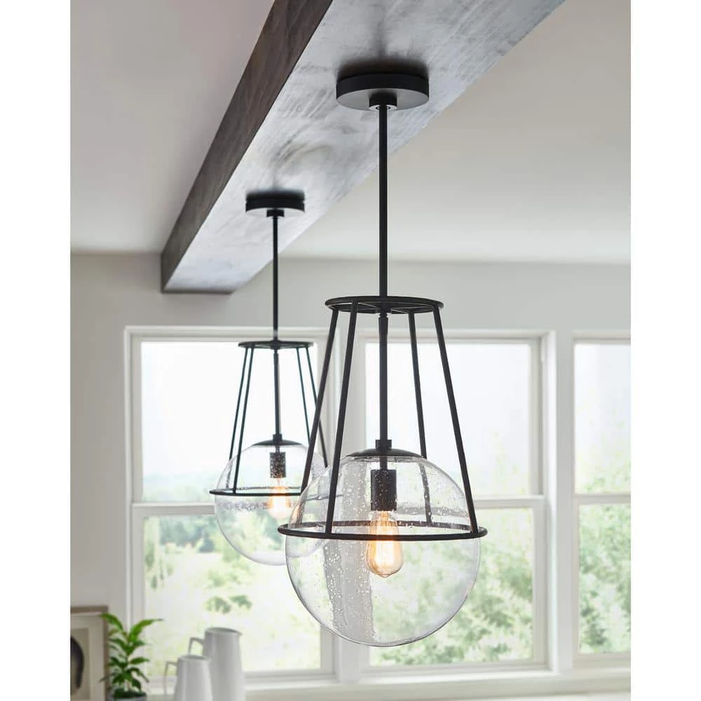 The Atlas Pendant exude touches of mid-century modern style with rustic undertones. A hand-forged Aged Iron finish pairs with a hand-blown Clear Seeded Glass globe shade to complete this minimalist design that’s sure to make a statement. This pendant is dimmable.