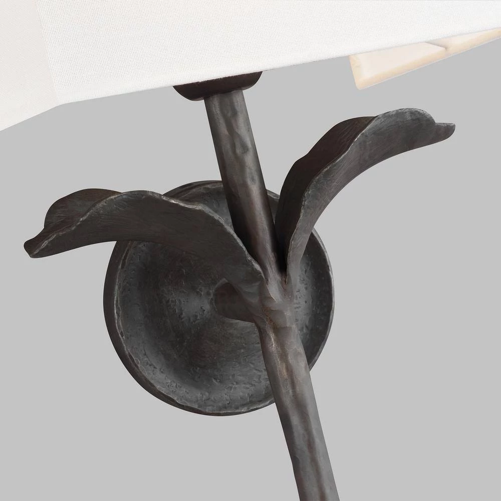 The Georgia Wall Sconce channels the natural beauty of flourishing leaves with perfect symmetry balanced by a circular backplate and a rectangular shade in fresh White Linen. Superior craftsmanship using a lost-cast wax technique results in a textured Aged Iron finish that resembles hand-forged iron. This fixture is dimmable.