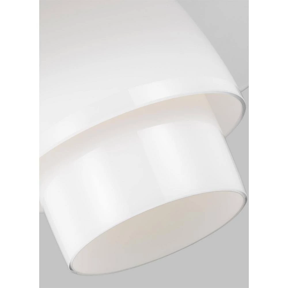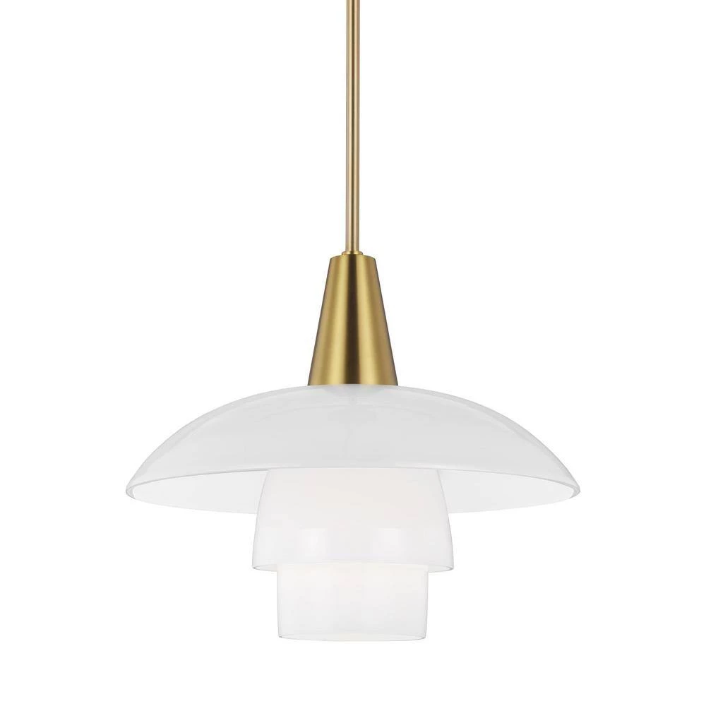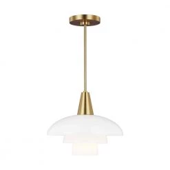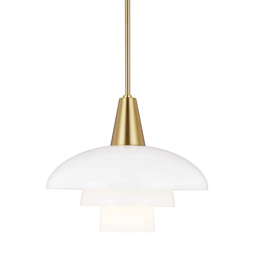 The Rossie one light indoor pendant in Burnished Brass from ED Ellen DeGeneres features hand blown stacked individual layered milk glass shade, creating a sleek look that is both stylish and functional. The table lamp has a metal cascading shade with its light source completely invisible, because it is hidden within the shade. The light is diffused through the opal glass lampshades, which are arranged in a logarithmic spiral.