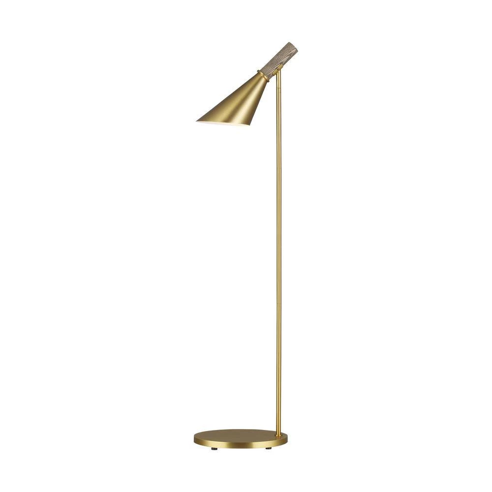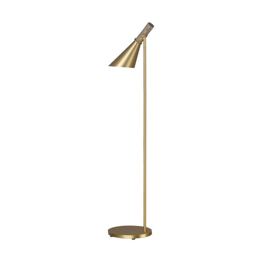 The Wells 1-light floor lamp from ED Ellen DeGeneres has a spun metal shade that is capped with a weathered oak cylinder connecting it to the stem. This floor lamp has an asymmetrical appearance with a shade to focus the light for reading or tasks. In the Wells floor lamp, a spun metal shade is capped with a weathered oak cylinder connecting it to the stem.