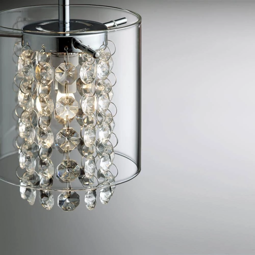 With an elegant contemporary style, the Glam Topaz Collection Beads Hanging Pendant from BAZZ features sparkling crystal glass beads housed behind a clear glass shade. A striking addition to the living room, dining room, kitchen and even hallways, this chic pendant uses a G9 40-Watt light bulb to brighten any part of your home. Smooth, gleaming chrome construction creates a sturdy frame that is built to last.