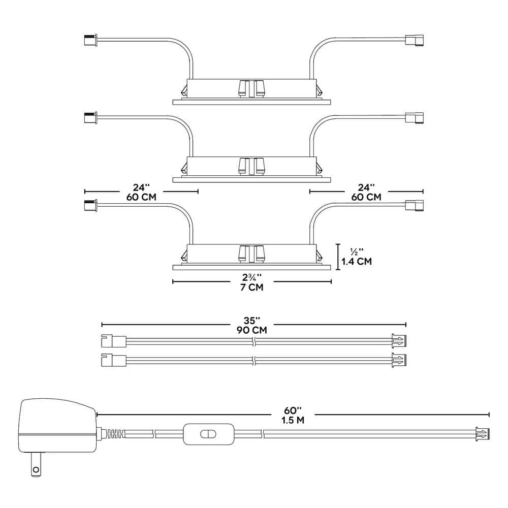 - Dimension: 2¾ in. with 2 x 24 in. connection cord/puck, 60 in. power cord with two intensity switch, extension cord: 2 x 35 in.