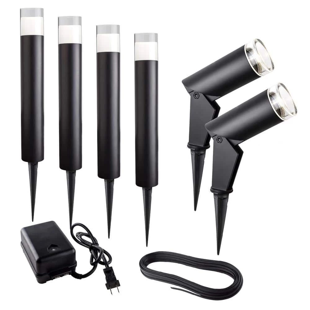 Take your outdoor decor to the next level with the remarkable 6-Piece Luvia Landscape Lighting Kit from BAZZ. Featuring subtle, contemporary style and understated design, it has everything you need to enhance your landscape lighting solution. This outdoor kit is engineered to compliment your landscape with its sleek construction, providing just the right amount of ambiance. The kit includes four 14 x 2 in. bollards with black aluminum structure and clear acrylic shades which give the impression of light suspended mid-air. The two included spotlights rotate from 0 to 90 offering endless variation. Each bollard and spotlight includes a long-lasting LED bulb. Also included are a discreet low voltage 40-Watt power source and a 100 ft. underground cable, making installation incredibly easy. You can be sure the 6-Piece Luvia Landscape Lighting Kit will be a fixture of your outdoor lighting solution for years to come.