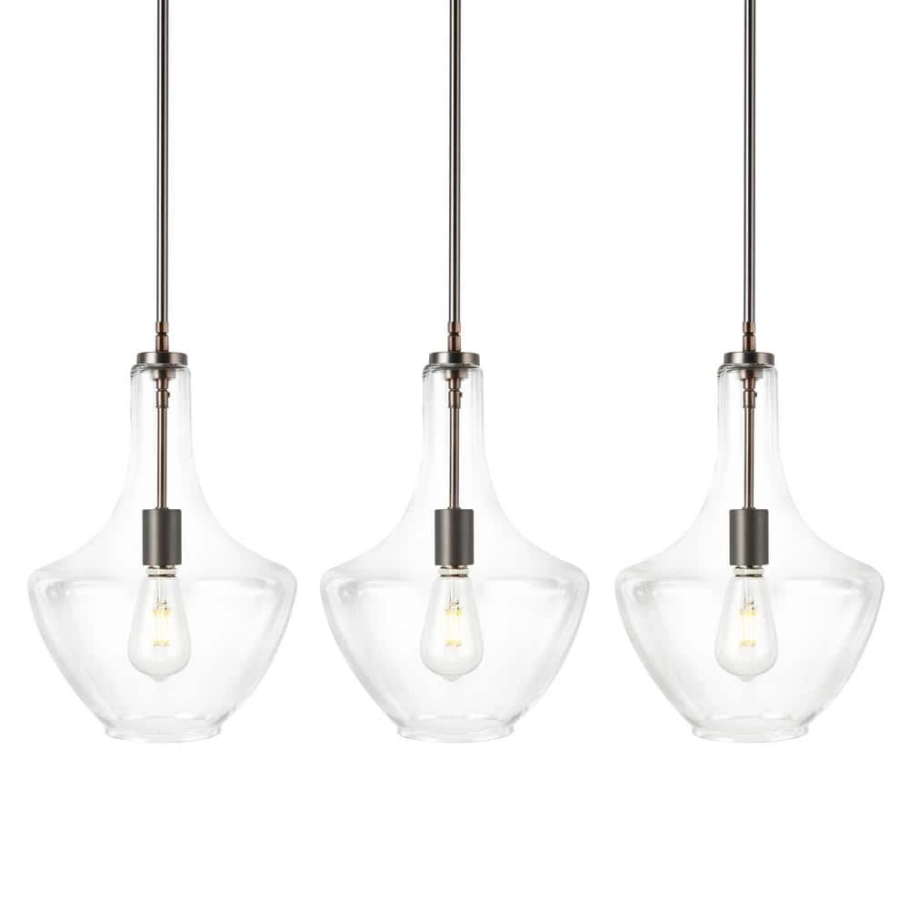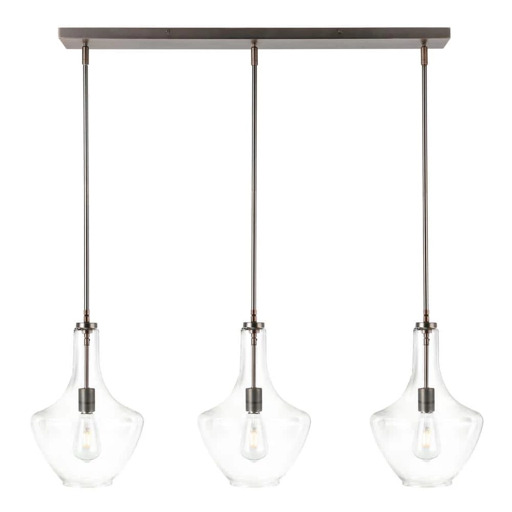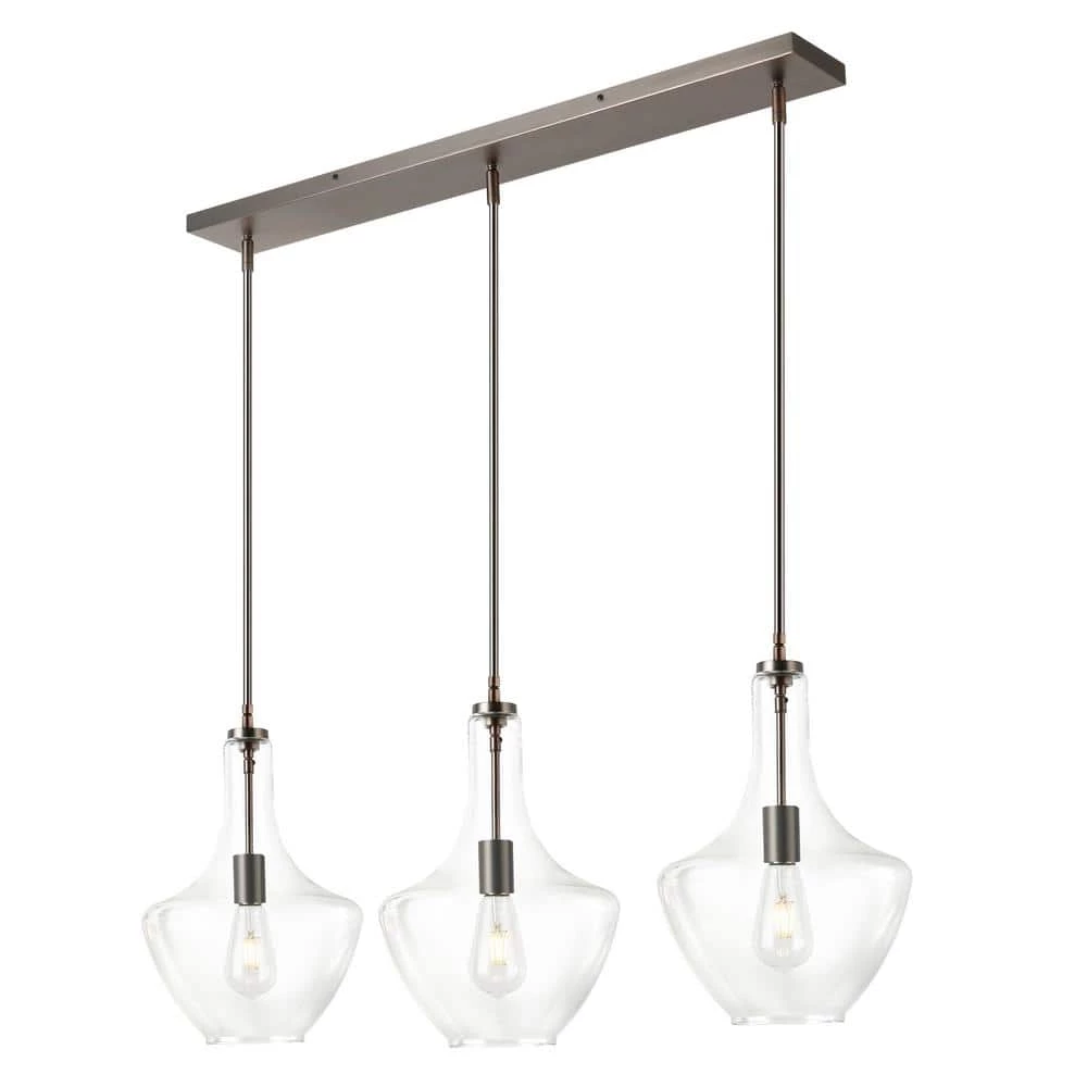 We loved the contemporary vase silhouette of our Sienna Pendant Lamp so much that we decided to turn it into an island light-meet the Modena 3-Light Island Light. The perfect finishing touch to a long table or kitchen counter, the Modena comes in a choice of three finishes-modern bronze with clear shade, satin nickel with silver mercury shade, and satin nickel with smokey shade. Whichever option you choose, the results will be dazzling.