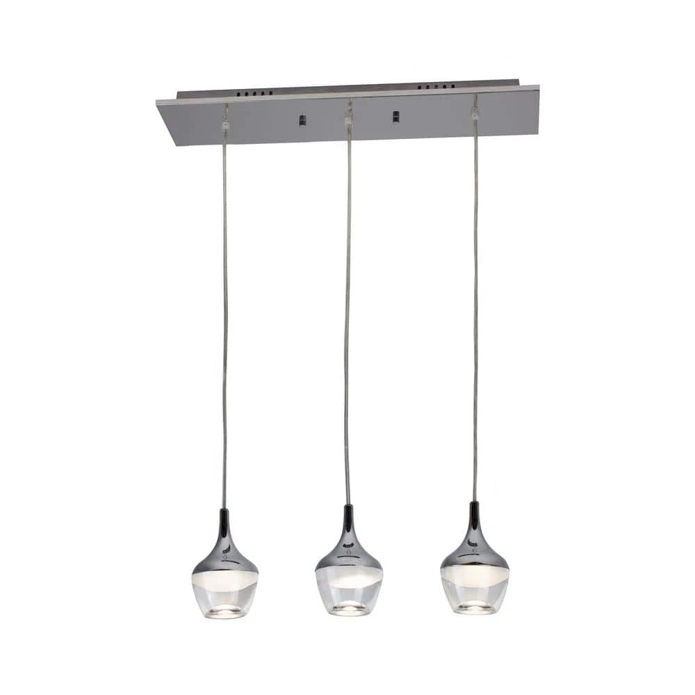This Bazz triple pendant will look great hanging in a kitchen, dining room, hallway or entryway. With its clear acrylic shade and chrome structure this pendant will glow and surely impress your guests. It uses 3 x integrated LED technology 5-Watt (400 lumens each pendant).