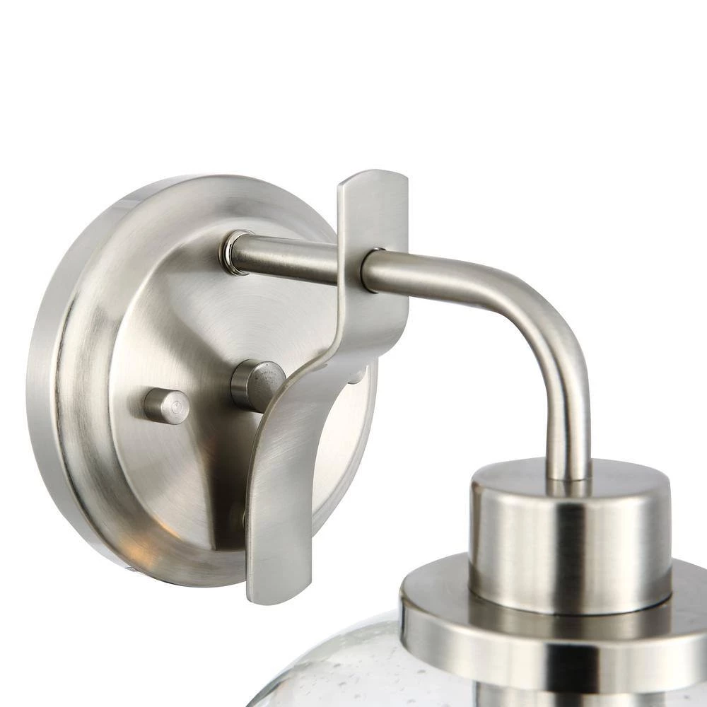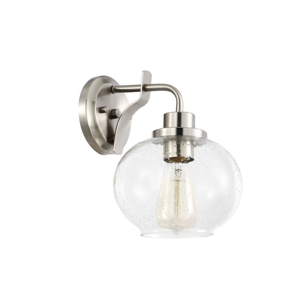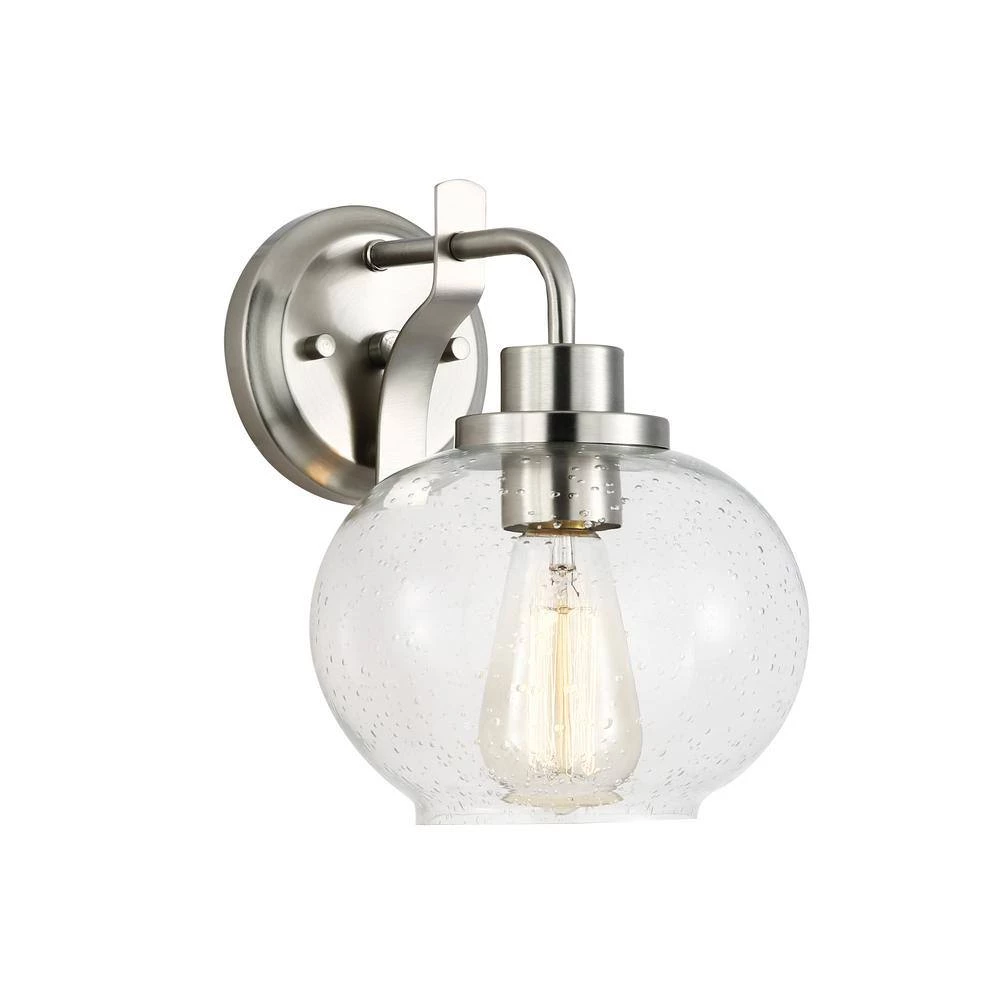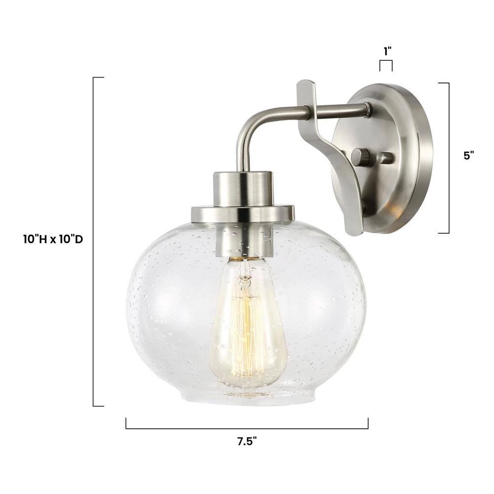 The Sheridan Wall Sconce brings a subtly artful allure to any contemporary space. With the sensual look of a curvy gourd-shape shade made from seeded glass, its elegance is undisputed. Sleek satin nickel finish metal creates a lovely round wall mount and holder that emphasizes a modern motif. Dimmable technology allows for adjustable lighting levels from an LED-compatible energy-saving fixture.