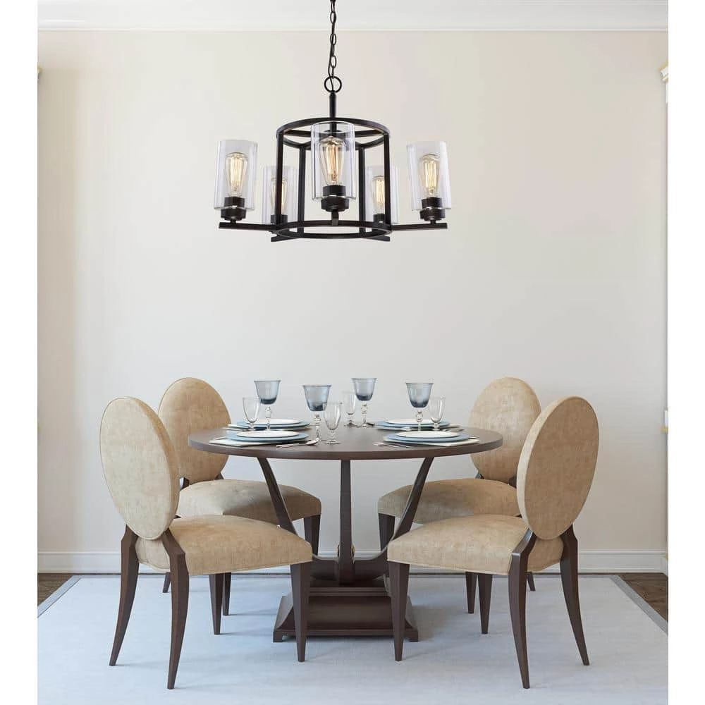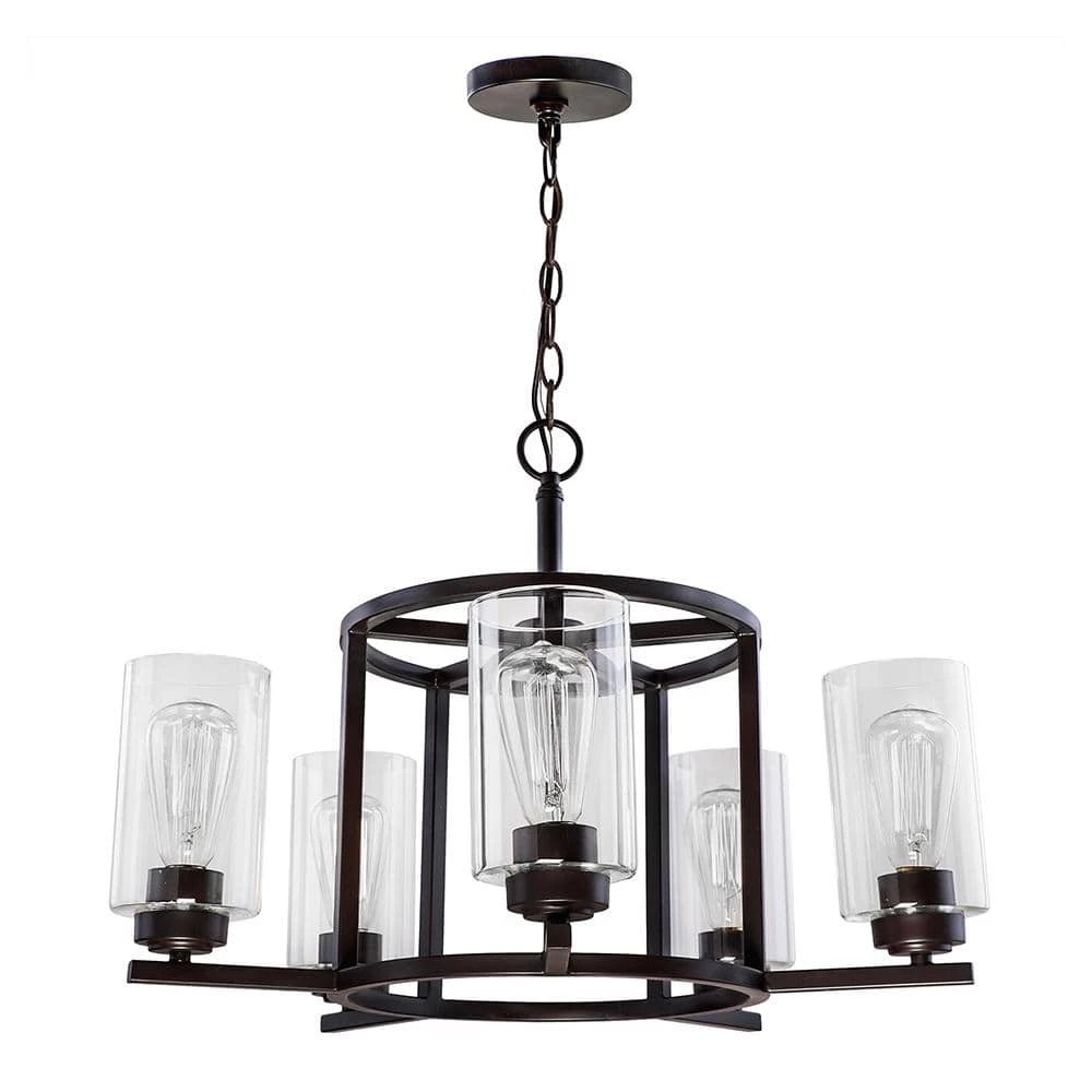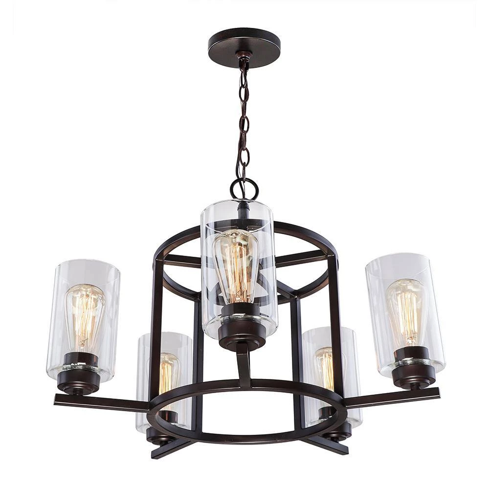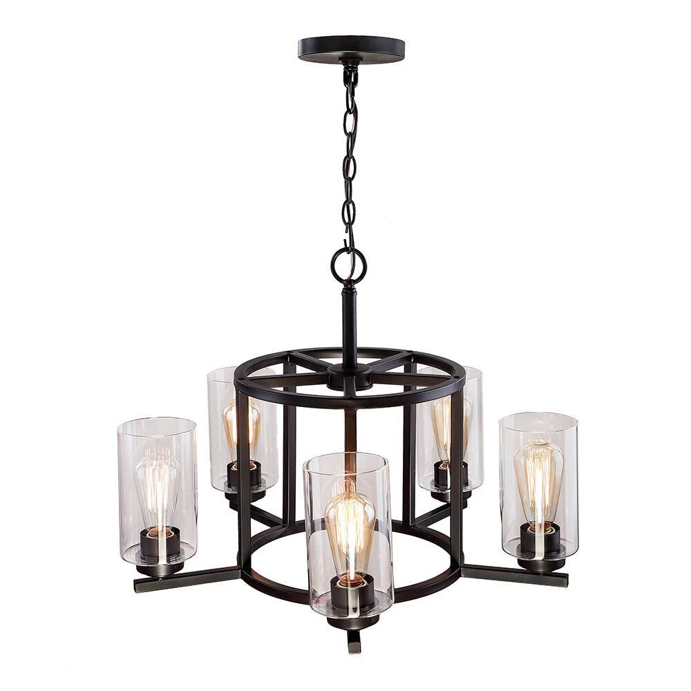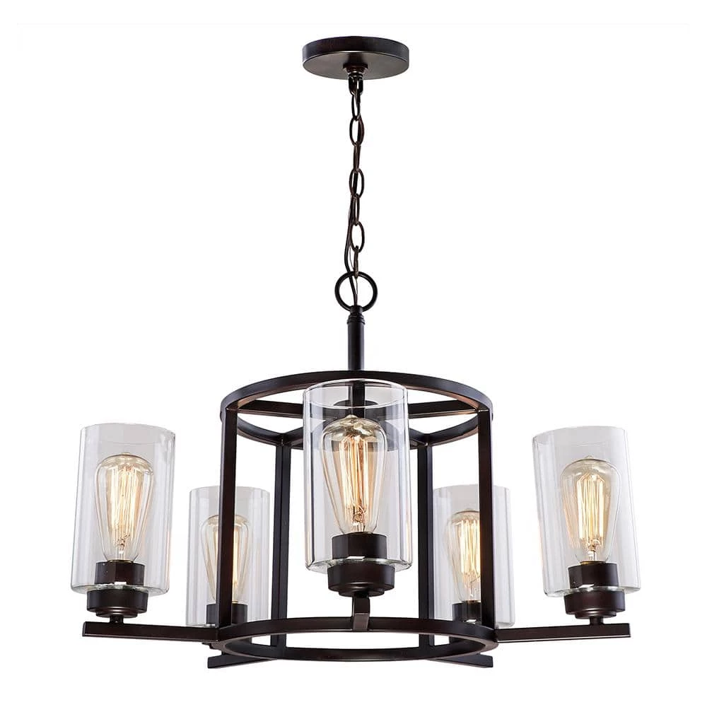 With a sophisticated design, this fabulous 5-light fixture is sure to add that little extra to any room. Features a bronze finish with clear glass cylinder shades. Pair with vintage style bulbs (not included) to add an extra touch of industrial design and style. Adjustable chain for the perfect height every time.